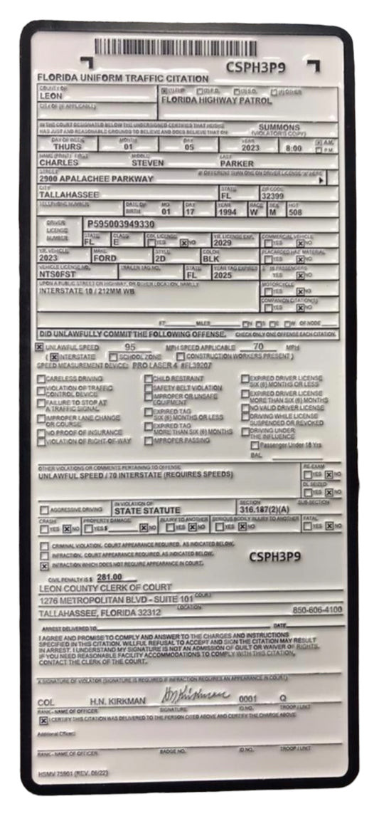 Florida Highway Patrol White Copy Traffic Citation Challenge Coin Ticket FHP State Trooper